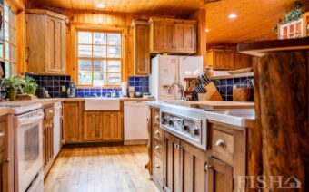 As you enter through the front door, you are greeted with large open ceilings and a welcoming lodge atmosphere. The large wood burning fireplace is the center of attention as you enter. Cozy up on the couch and enjoy a cup of hot cocoa, regardless of the season. The open floor plan has a kitchen that has one of everything, or two! There are two refrigerators, a stove, microwave, dishwasher, flat top grill, two dishwashers, toaster, pizza oven, and a little bit of everything else you would need! There are four barstools for a quick brunch.