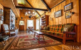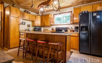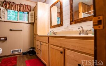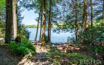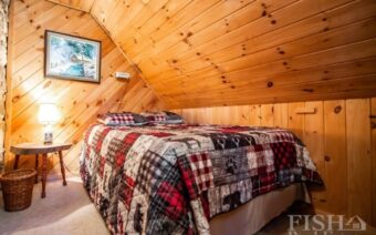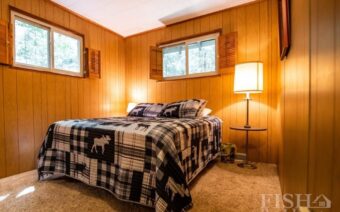 This cottage is nestled in the woods on the west shore of Lake Mokoma. Enjoy a relaxing day boating in a rowboat or canoe then return to spend a quiet evening around the fire pit. The great views continue into the home with an open living/dining room area featuring a stone fireplace. The den has a TV and access to the deck with a picnic table. The eat-in kitchen has a stove, refrigerator, microwave, and a toaster. The first floor bedroom has a queen sized bed with a separate full bath. The second floor has three additional bedrooms, two each with queen size beds and the third bedroom has a double sized bed.
