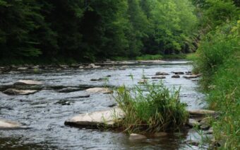 A well-stocked trout stream, the Meshoppen Creek, rushes a winding path through the campground before reaching the splendor of a 20-foot waterfall cascading over rocks worn smooth with the ages. High above the falls, a scenic overlook allows visitors a breathtaking view of the creek and the fern-covered rugged cliffs cut from glaciers millions of years ago. The Commonwealth of Pennsylvania recognized the beauty of this creek by including it in its annual Scenic River poster series.