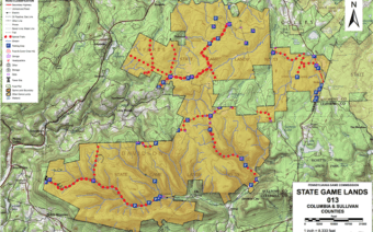 State Game Land 13 (SGL 13) consists of 49,528.72 acres. Located in the Pennsylvania Game Commission’s Northeast Region, covering parts of Sullivan and Columbia Counties it is the largest state game lands in the state.