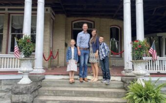 A red room with large bay windows and a chandelier in the Metcalf Mansion. The music room of the Metcalf Mansion Entryway and grand staircase in the Metcalf Mansion The Ebersole family, owners of the Metcalf Mansion, pose on the front porch.