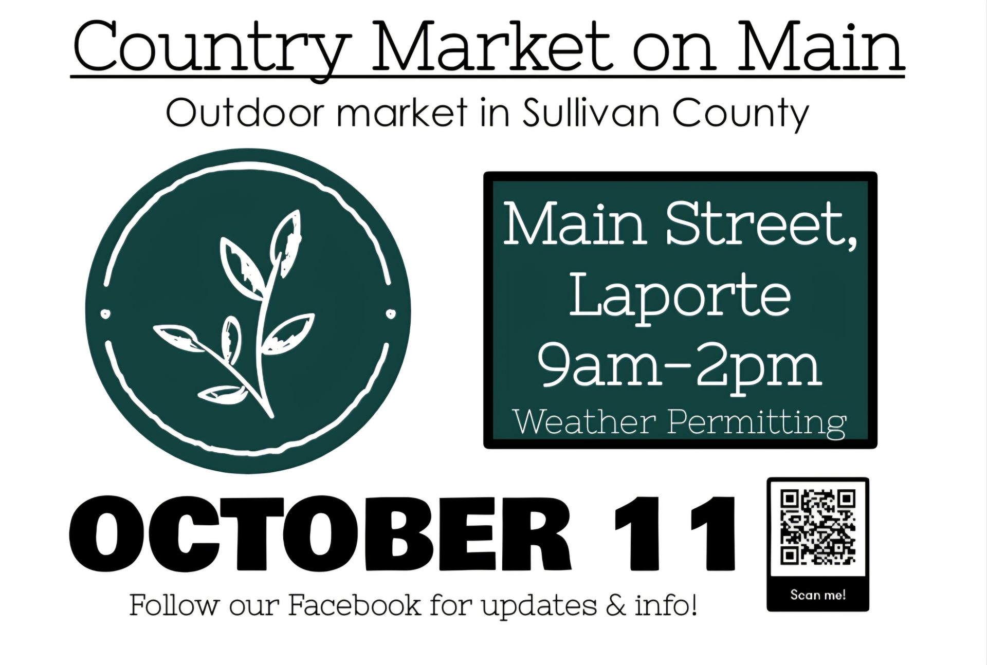 Country Market on Main is an outdoor country market in the heart of beautiful Sullivan County, PA, featuring homemade, homegrown, and unique finds! You’ll find local vendors, food trucks, coffee, music, crafts, art, wellness, pottery, gifts, and more along Main Street, Laporte! Follow our Facebook page for updates. This event is weather permitting.