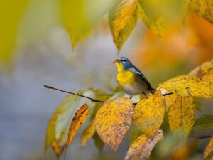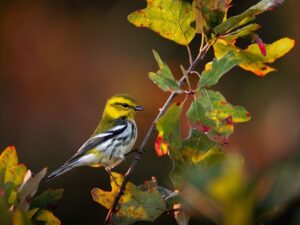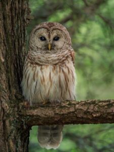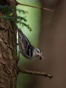 Wildlife photography by Andrew Creager. Top to bottom: “Northern Parula in Fall,” “Black Throated Green Warbler in Fall,” “Nesting Black and White Warbler,” and “Barred Owl.”
