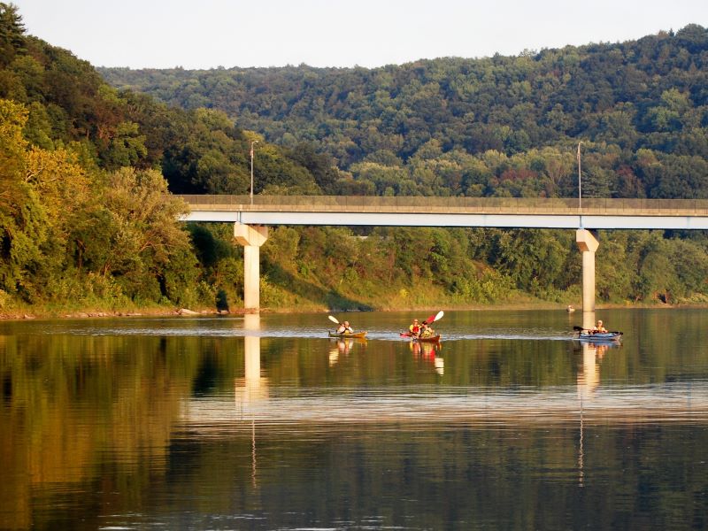 “My favorite day trip is from Meshoppen or Mehoopany [private launch] through the Vosburg Neck and finishing up in Tunkhannock’s Riverside Park,” said Art Coolbaugh, owner of Susquehanna Kayak & Canoe Rentals. “This is a fourteen- or eleven-mile paddle depending on your starting launch which offers both slow pools as well as faster water, great fishing, and towering mountains through the Vosburg Neck with so many eagle sightings.”